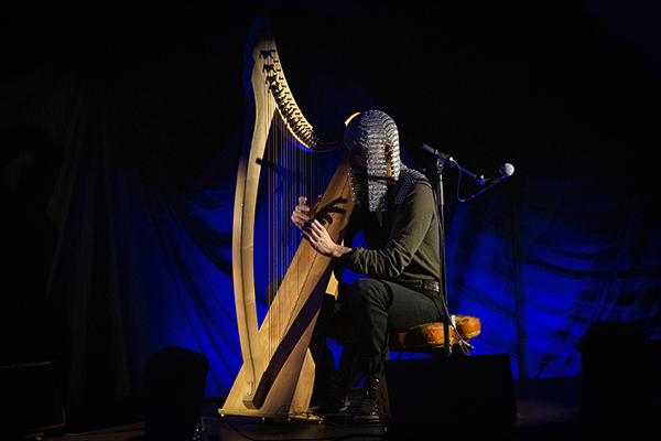 Die letzte Darbietung im Pandora-Foyer kam vom Klang-Alchemisten :: ANDY AQUARIUS ::, der mit seiner keltischen Harfe mystische, folkloristische Atmosphäre erzeugte. Hier gab es endlich ein wenig mehr Licht (vermutlich, damit er die Saiten der Harfe erkennt), so konnte man sehen, dass der Mann einen Kettenhemd-Helm trug. Zwischen zwei Tracks vom 2021iger Album Chapel, gab es neues, bis dato unveröffentlichtes Material.
